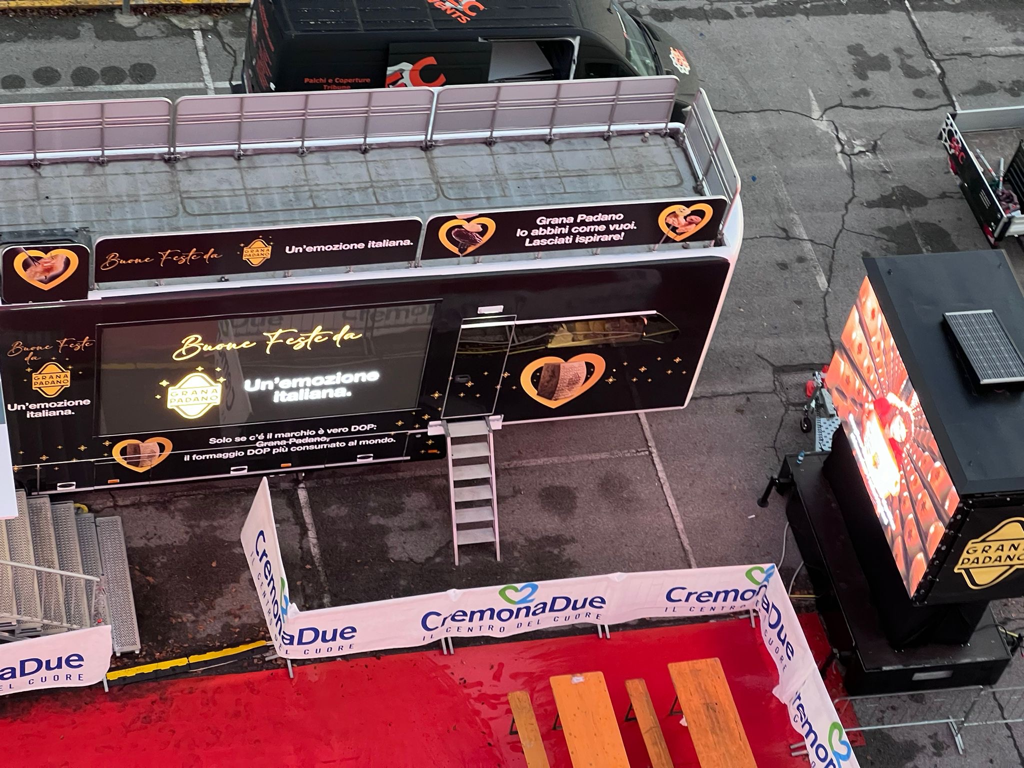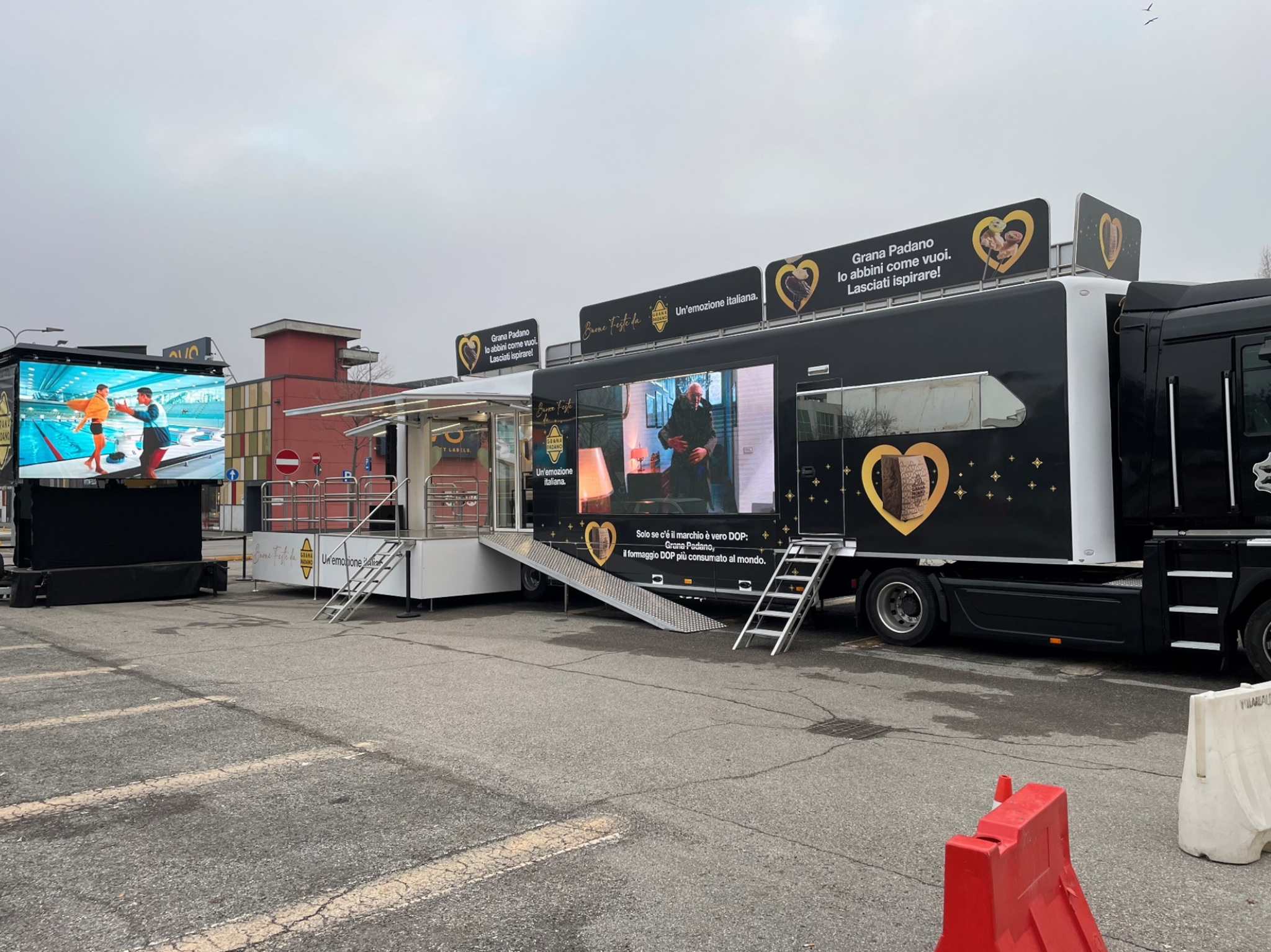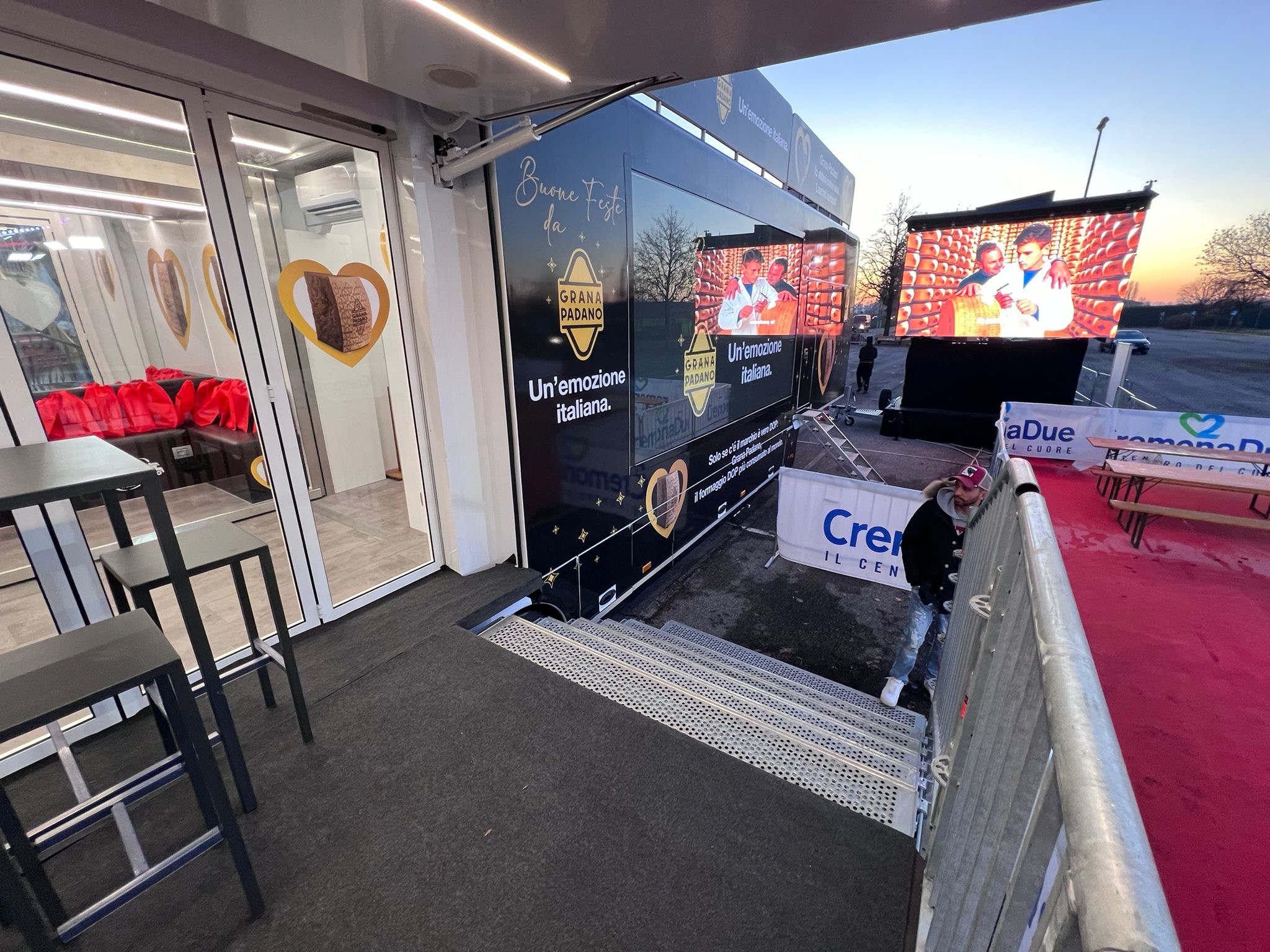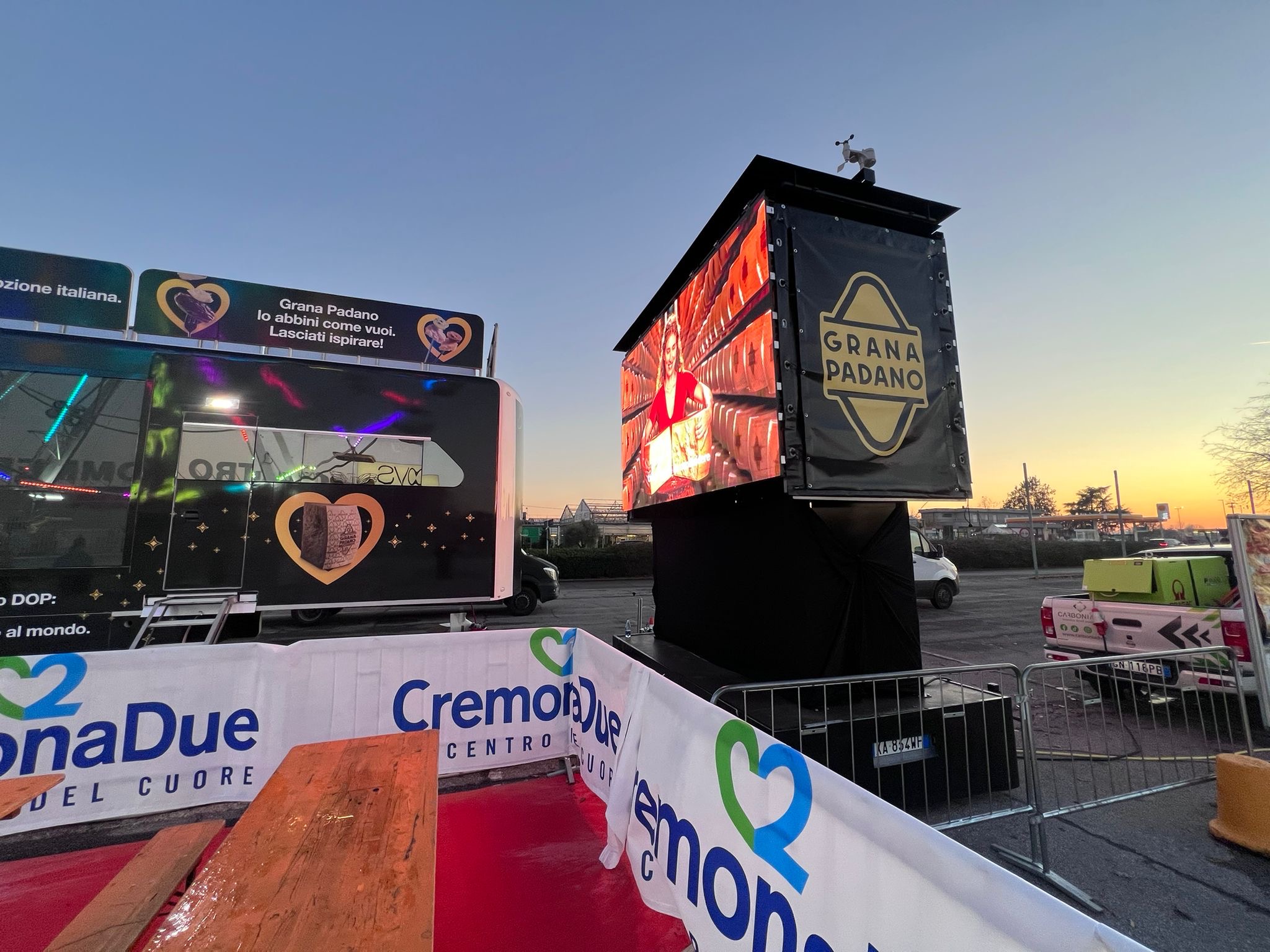 Per il Consorzio per la Tutela del Formaggio Grana Padano a dicembre 2023, Carboni ADV ha ideato e curato la campagna “Xmas Truck”. L’imponente truck brandizzato di 14 metri ha fatto tappa al Centro Commerciale CremonaDue, a La Grande Mela Shoppingland e al Centro Commerciale Galleria Borromea catalizzando l’attenzione di tutti coloro che transitavano nella zona con un impatto diretto sul punto vendita della g.d.o. Le immagini emozionali trasmesse dal grande videowall presente sulla fiancata e del trailer ledwall bifacciale posizionato accanto hanno invitato i visitatori a salire sul mezzo per partecipare all’iniziativa con foto ricordo e omaggi di pregio.